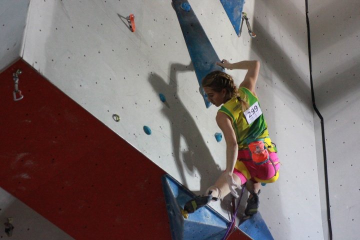 В трудности Юля вылезла две квалификационные трассы и попала в финал первой. Единственный минус скалодрома, где часто проводят соревнования, это проблемы с расположением трасс. Для взрослых групп трассы делают в одном и том же месте, на карнизе. На этих соревнованиях был новый подготовщик, было интересно попробовать другой стиль.