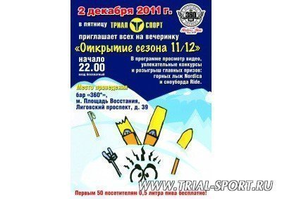 2 декабря в Санкт-Петербурге, «Триал-Спорт» приглашает всех на вечеринку "Открытие сезона 2011/2012", которая пройдет...