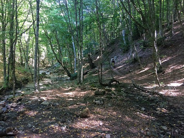 В сторону массива поднимается ещё один пеший маршрут - №54, в начале достаточно пологий, чтобы ехать, но вскоре увеличившийся градиент вынудил спешиться и поднять байк на плечи.