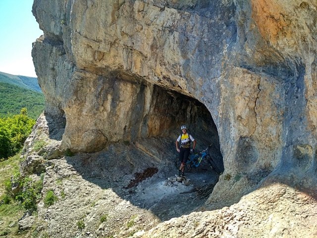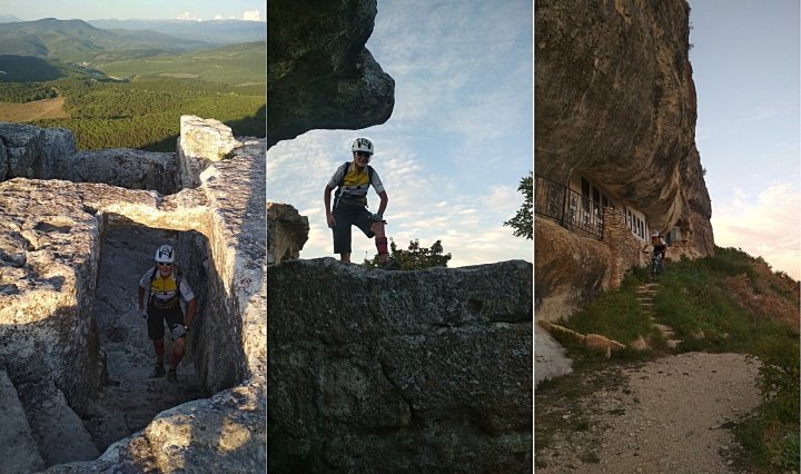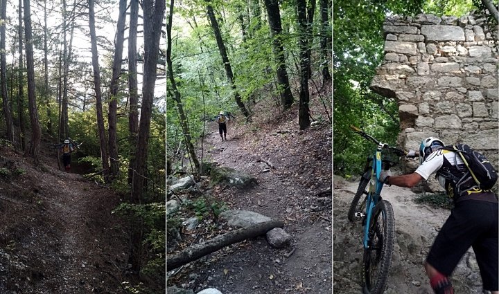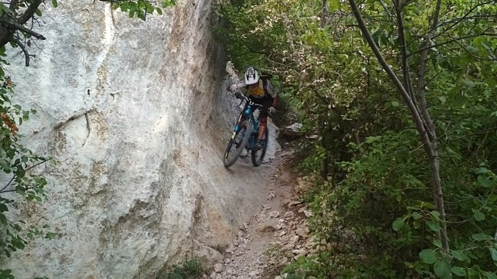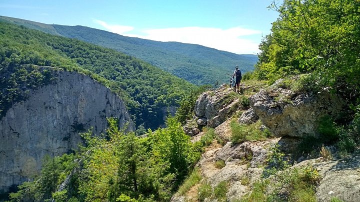 Тропа достаточно широкая и местами видны следы её расчистки, но ни малейшего намека на следы покрышек я не увидел, только редкие черные штрихи, оставленные Женей, едущим впереди и вновь включившего мартышку своими восторженными эмоциями. Осматривая Мангуп-Кале, я задумывался о том, какой же вариант спуска с плато предложит мой предводитель, как и я, оказавшийся здесь впервые, но и представить не мог, что это будет выстрел в яблочко и наповал! Браво и Бис!