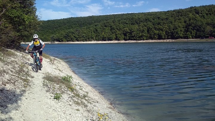 Своё рождение оно, имеющее форму почти прямоугольника 1000х200м с глубиной до 20 метров ведет свою историю с 60-х годов прошлого века и питается ключевыми и талыми водами. Карстовые породы не могли удержать воду, поэтому дно водохранилища тогда было укреплено, а вокруг него была воздвигнута 10-метровая дамба. Вода в основном используется для полива полей, поэтому здесь ни у кого нет возражений против многочисленных организованных здесь зон купаний и отдыха, привлекающих туристов. Под устойчивым запахом шашлыка мы прокатились тропой, шныряющей вдоль берега, пока не удалились прочь от воды.