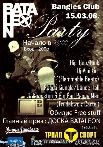 В субботу 15 марта всех истинных фанатов сноуборда приглашаем на промо-вечеринку "Bataleon Snowboards" в клуб "Bangles"...