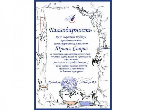 Сеть магазинов «Триал-Спорт» отметили благодарностью за спонсорскую поддержку 4-го кубка России-2012 по скалолазанию.